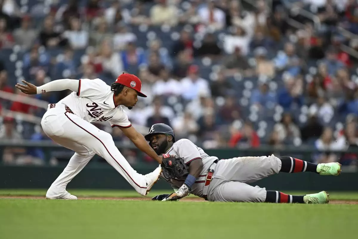 Atlanta Braves' Michael Harris II is tagged out by Washington Nationals third baseman José Tena while attempting to advance to third base on a fielder choice thrown by shortstop CJ Abrams on a ball hit by Nick Allen during the second inning of a baseball game in Washington, Tuesday, May 20, 2025. (AP Photo/Terrance Williams)
