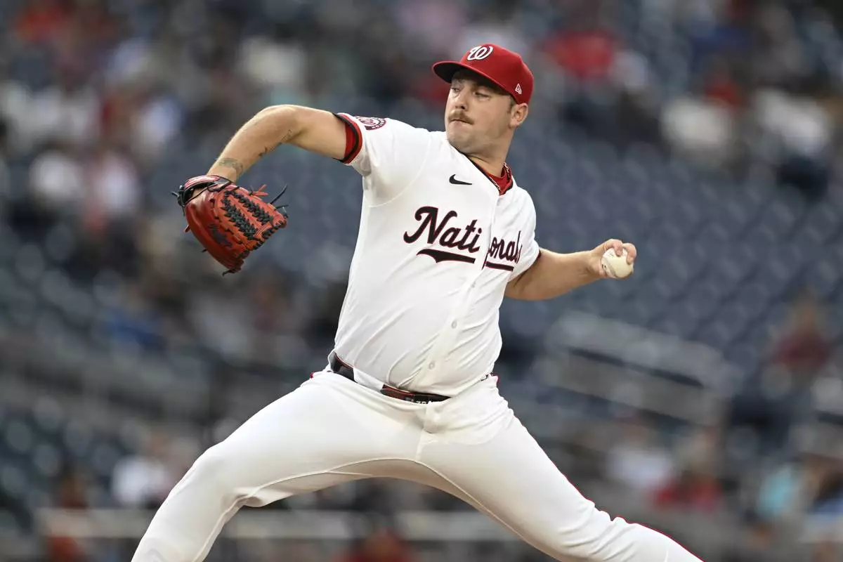 Washington Nationals pitcher Mitchell Parker throws during the second inning of a baseball game against the Atlanta Braves in Washington, Tuesday, May 20, 2025. (AP Photo/Terrance Williams)