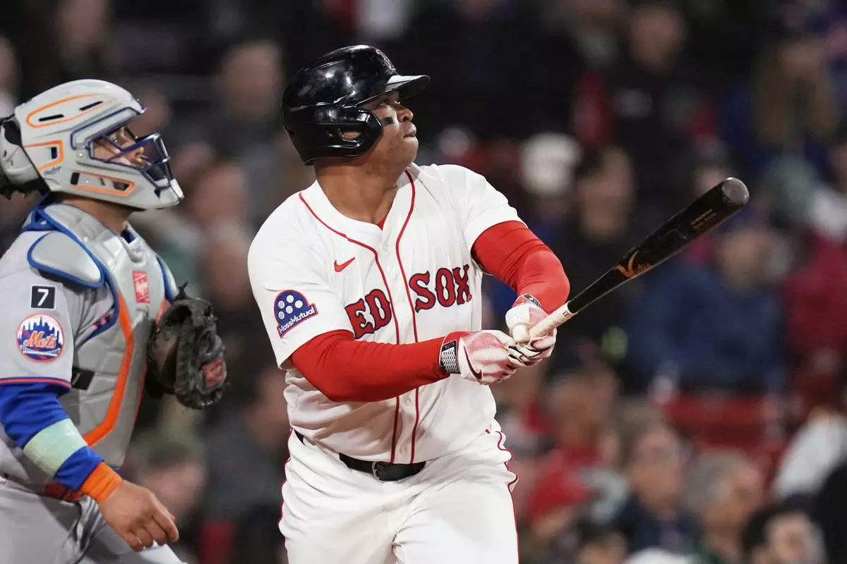 Boston Red Sox designated hitter Rafael Devers watches the flight of his solo home run during the fifth inning of a baseball game against the New York Mets at Fenway Park, Tuesday, May 20, 2025, in Boston. (AP Photo/Charles Krupa)