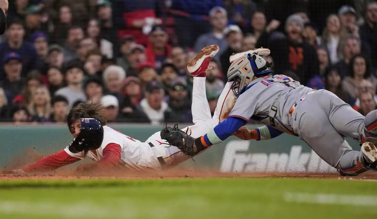Boston Red Sox's Nick Sogard, left, is tagged out by New York Mets catcher Francisco Alvarez while trying to score on a line out by Carlos Narvaez during the second inning of a baseball game at Fenway Park, Tuesday, May 20, 2025, in Boston. (AP Photo/Charles Krupa)