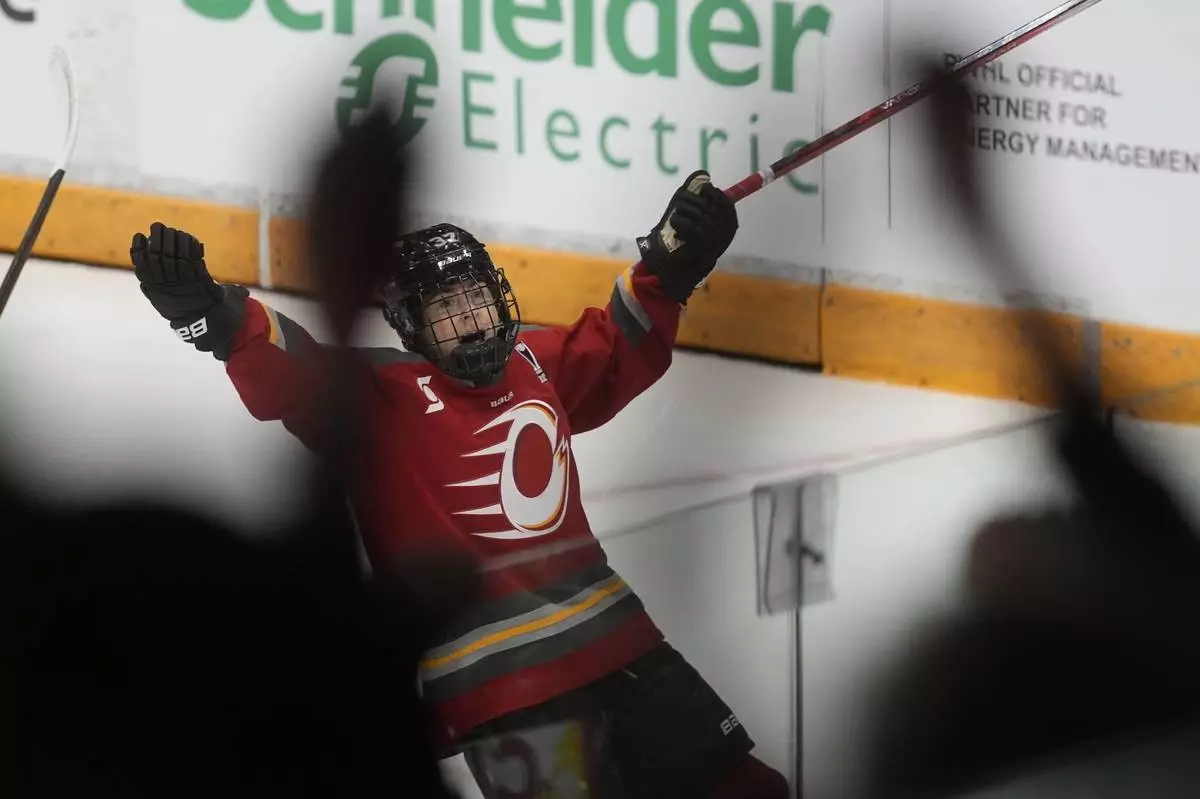 Ottawa Charge forward Rebecca Leslie (37) celebrates her goal against the Minnesota Frost during second period of a PWHL final game, Tuesday May 20, 2025 in Ottawa. (Adrian Wyld/The Canadian Press via AP)