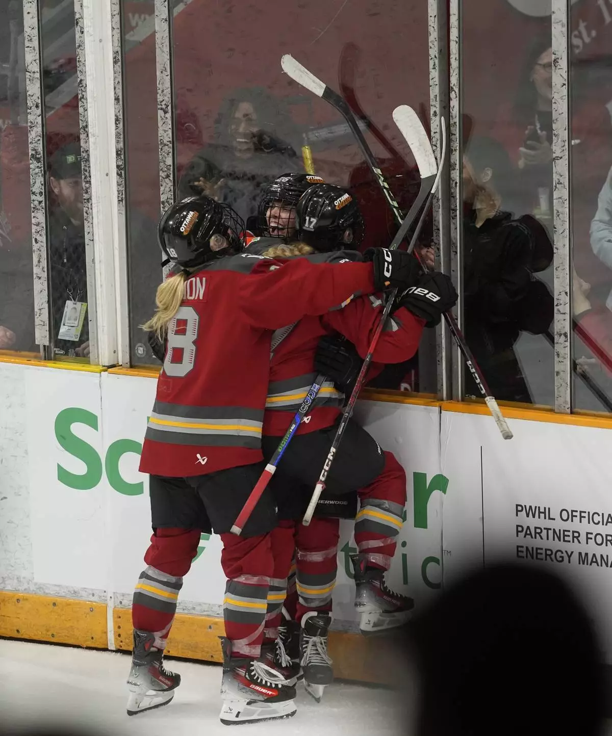 Ottawa Charge forward Emily Clark (26) celebrates her game winning overtime goal with teammates Mannon McMahon (18) and Gabbie Hughes (17) during overtime action against the Minnesota Frost in the PWHL final, Tuesday May 20, 2025 in Ottawa. (Adrian Wyld/The Canadian Press via AP)