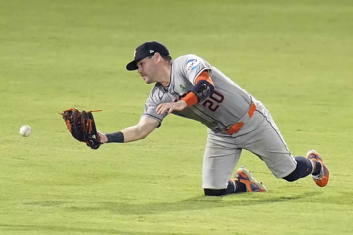 Houston Astros outfielder Chas McCormick (20) can't make the catch on a pop up by Tampa Bay Rays' José Caballero during the eighth inning of a baseball game Tuesday, May 20, 2025, in Tampa, Fla. (AP Photo/Chris O'Meara)