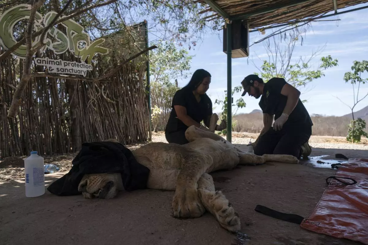 Staff prepare a lioness for transfer, at the animal refuge Ostok Sanctuary, on the outskirts of Culiacan, Mexico, Monday, May 19, 2025. (AP Photo/Felix Marquez)