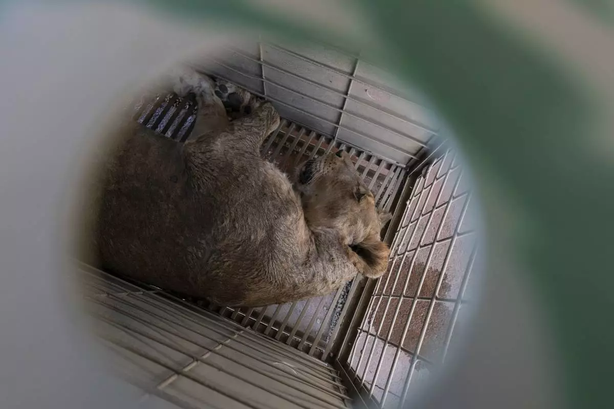 A lioness rests inside a transport cage at the animal refuge Ostok Sanctuary, on the outskirts of Culiacan, Mexico, Monday, May 19, 2025. (AP Photo/Felix Marquez)