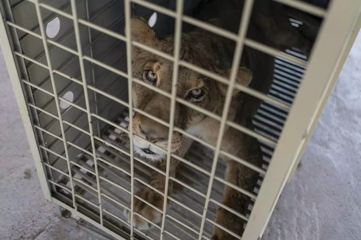 A lioness looks out from inside a transport cage at the animal refuge Ostok Sanctuary, on the outskirts of Culiacan, Mexico, Monday, May 19, 2025. (AP Photo/Felix Marquez)