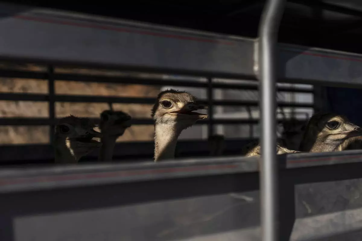 Emus from the Ostok Sanctuary sit in a truck while getting transported to Mazatlan, Sinaloa state, from the refuge in the outskirts of Culiacan, Sinaloa state, Mexico, Tuesday, May 20, 2025. (AP Photo/Felix Marquez)