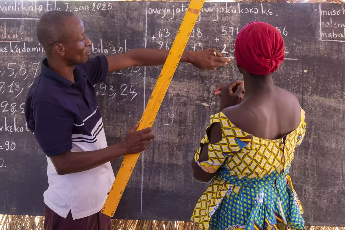 Sidi Yaya Sangare, left, teaches Bambara in a makeshift classroom in the village of Mountougoula, Mali, April 7, 2025. (AP Photo/Saydou Camara)