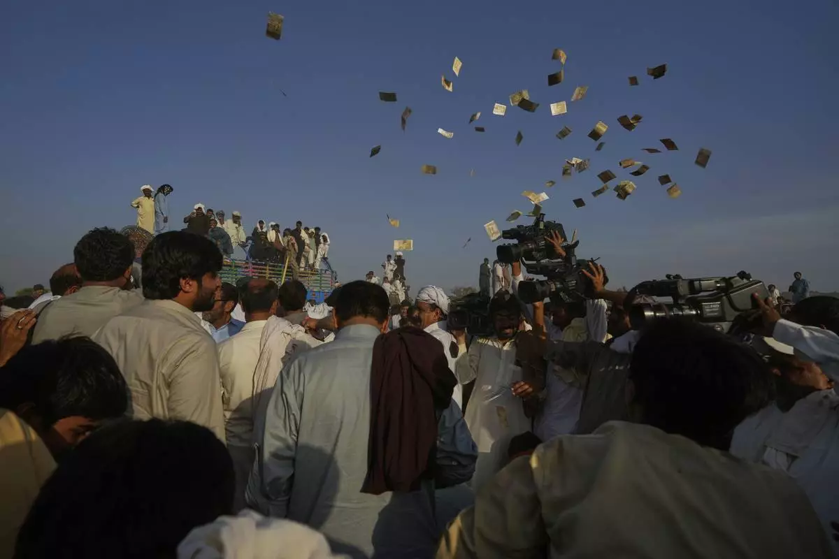 Members of a team blow currency notes in the air as they celebrating after winning a traditional bull race competition, in Malal, a village of Attock district, in Pakistan, Thursday, May 15, 2025. (AP Photo/Anjum Naveed)
