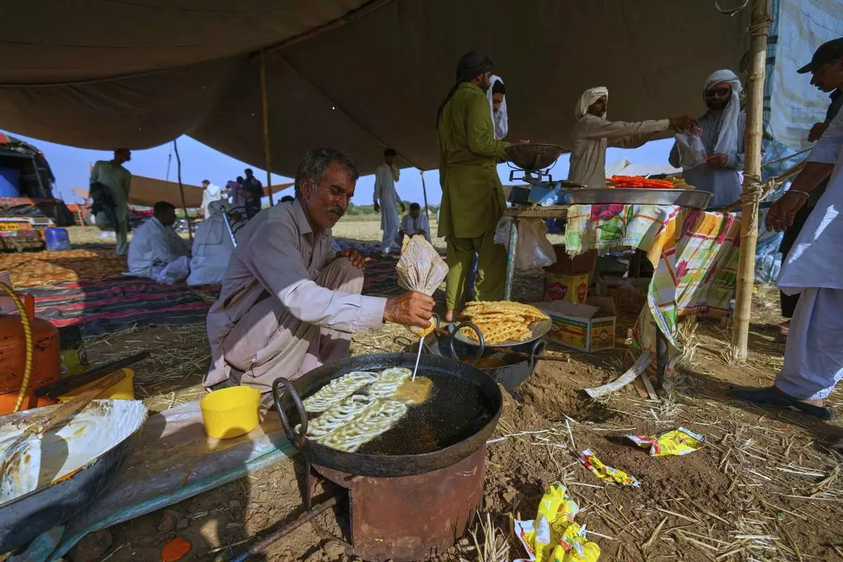 A vendor prepares traditional sweets called 'Jalebi' at his stall at the venue of a traditional bull race competition, in Malal, a village of Attock district, in Pakistan, Thursday, May 15, 2025. (AP Photo/Anjum Naveed)