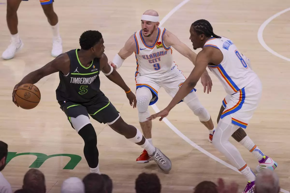 Minnesota Timberwolves guard Anthony Edwards (5) is double-teamed by Oklahoma City Thunder guard Alex Caruso (9) and forward Jalen Williams (8) during the second half of Game 1 of an NBA basketball Western Conference Finals playoff series Tuesday, May 20, 2025, in Oklahoma City. (AP Photo/Nate Billings)