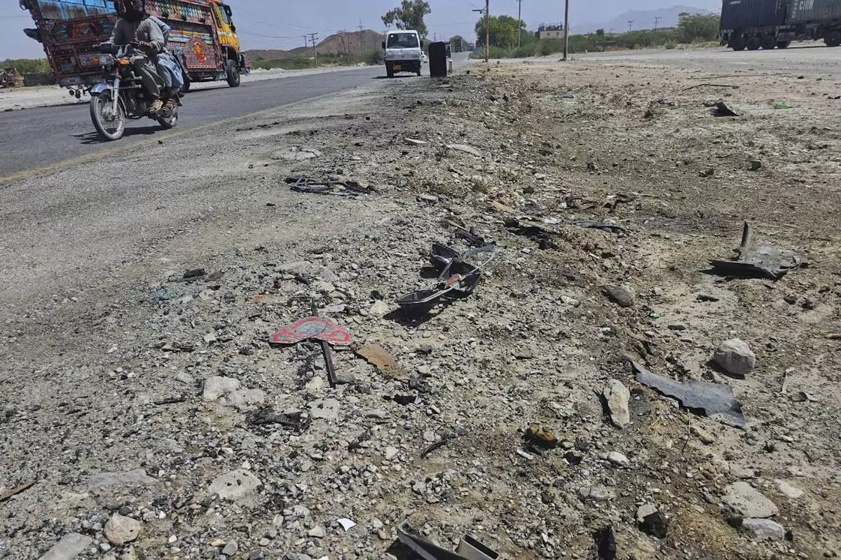 A motorcyclist and vehicles drive past the site of suicide bombing at a highway on the outskirts of the city of Khuzdar, in southwestern Pakistan, Wednesday, May 21, 2025. (AP Photo)