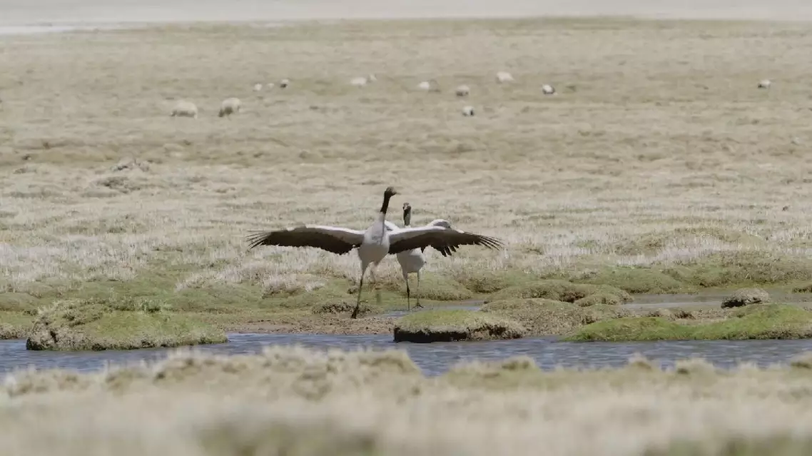 Black-necked cranes perform victory dance after chasing away intruding sheep