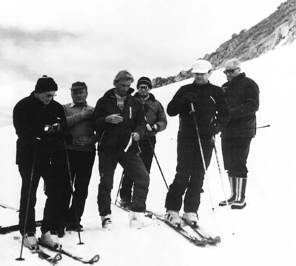 FILE - Pope John Paul II, left, joins other skiers in making the sign of the cross during his skiing vacation near this Northern Italian town, July 17, 1984. (AP Photo, File)