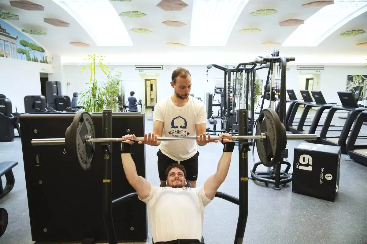 Personal trainer Valerio Masella, 26, who trained Robert Francis Prevost before the cardinal became Pope Leo XIV, helps his colleague Giorgio Vaccarella in his gym near the Vatican, Wednesday, May 21, 2025. (AP Photo/Alessandra Tarantino)