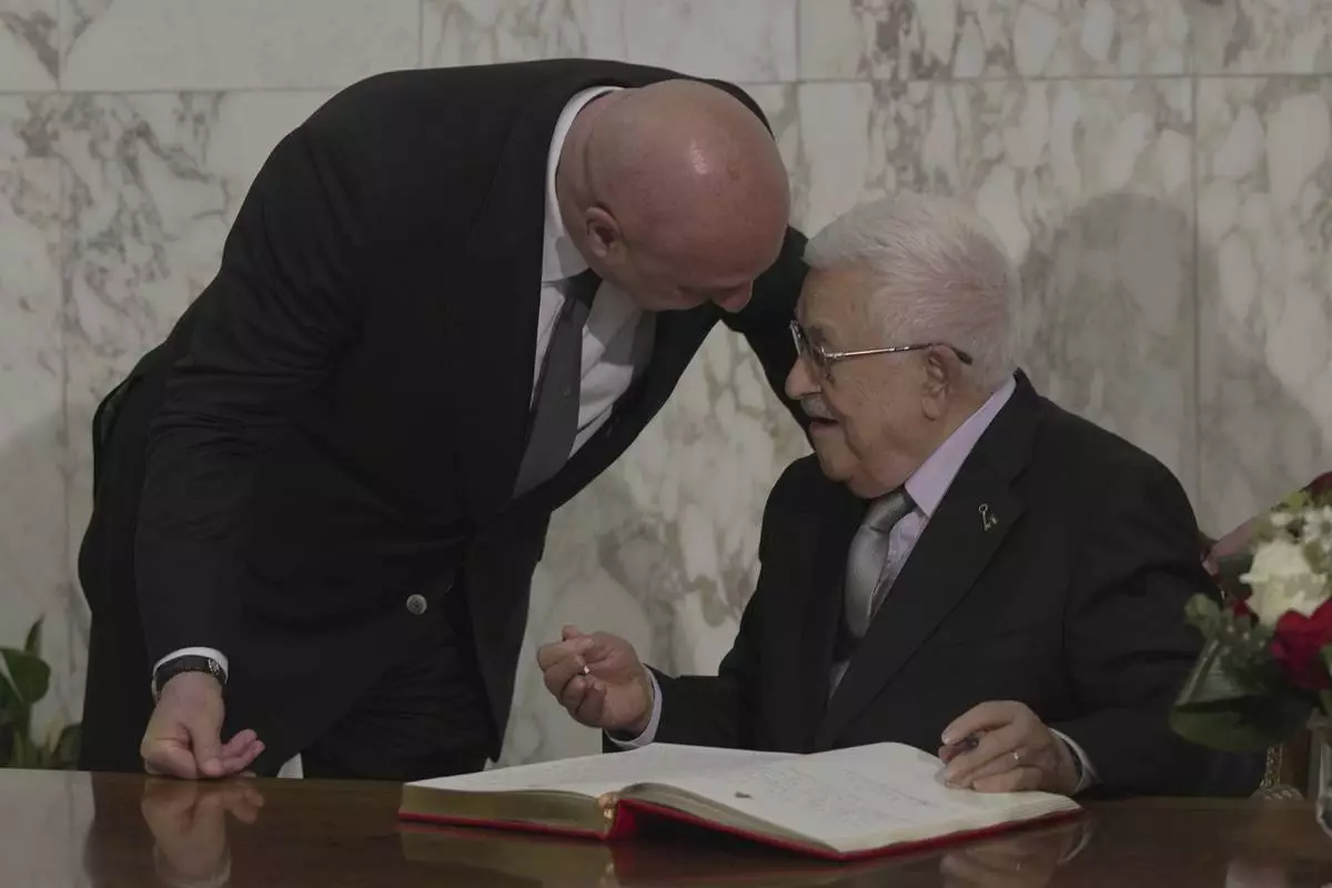 Palestinian President Mahmoud Abbas, right, speaks with Lebanese President Joseph Aoun, as he signs a guest book at the Presidential Palace, in Baabda, east of Beirut, Lebanon, Wednesday, May 21, 2025. (AP Photo/Hassan Ammar)