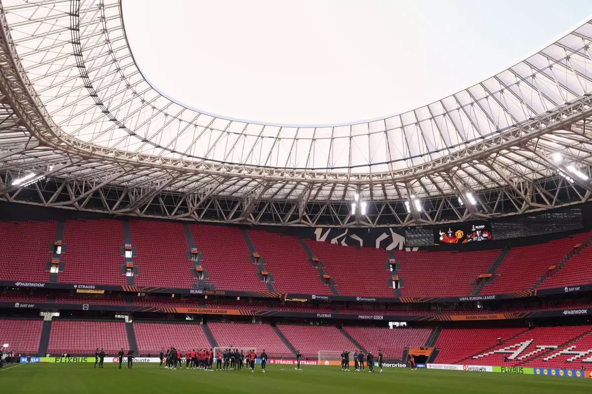 Manchester United players visit the pitch ahead of the Europa League final soccer match against Tottenham Hotspur at the San Mames Stadium in Bilbao, Spain, Tuesday, May 20, 2025. (AP Photo/Manu Fernandez)