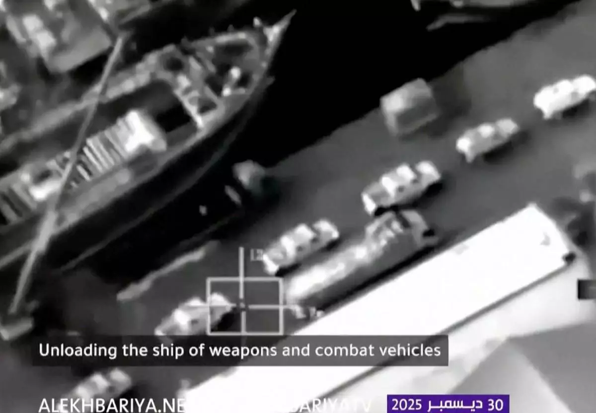 This frame grab from video broadcast by Saudi state television on Tuesday, Dec. 30, 2025, shows what the kingdom describes as a shipment of weapons and armored vehicles coming from the United Arab Emirates, at Mukalla, Yemen. (Saudi state television via AP)