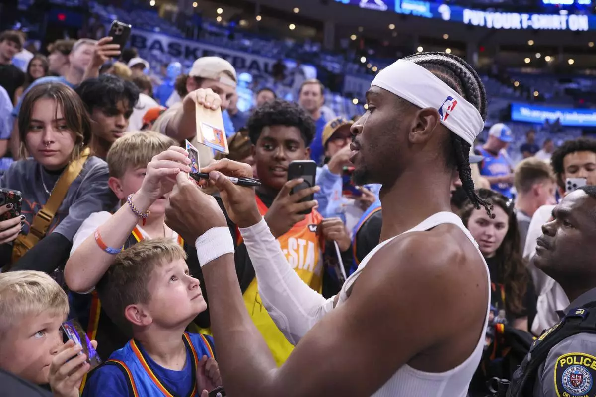 Oklahoma City Thunder guard Shai Gilgeous-Alexander signs autographs prior to Game 1 vs. Minnesota Timberwolves in a NBA basketball Western Conference Finals playoff series Tuesday, May 20, 2025, in Oklahoma City. (AP Photo/Nate Billings)