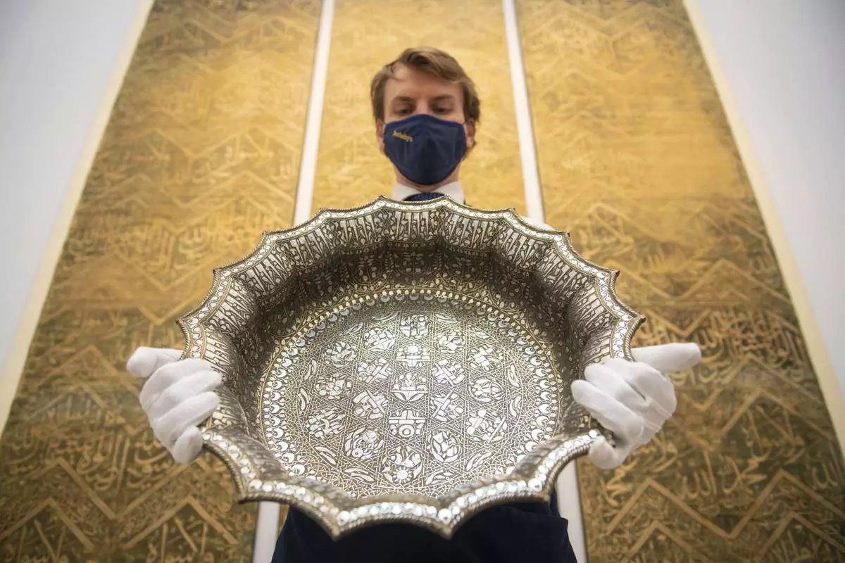 FILE - An employee at Sotheby's auction house holds a twelfth-century silver inlaid scalloped basin with astrological designs, estimated to fetch 1,000,000 - 1,500,000 sterling pounds, as part of the auction house's forthcoming Arts of the Islamic World and India sale on March 31, in London, March 29, 2021. (Dominic Lipinski/PA via AP)