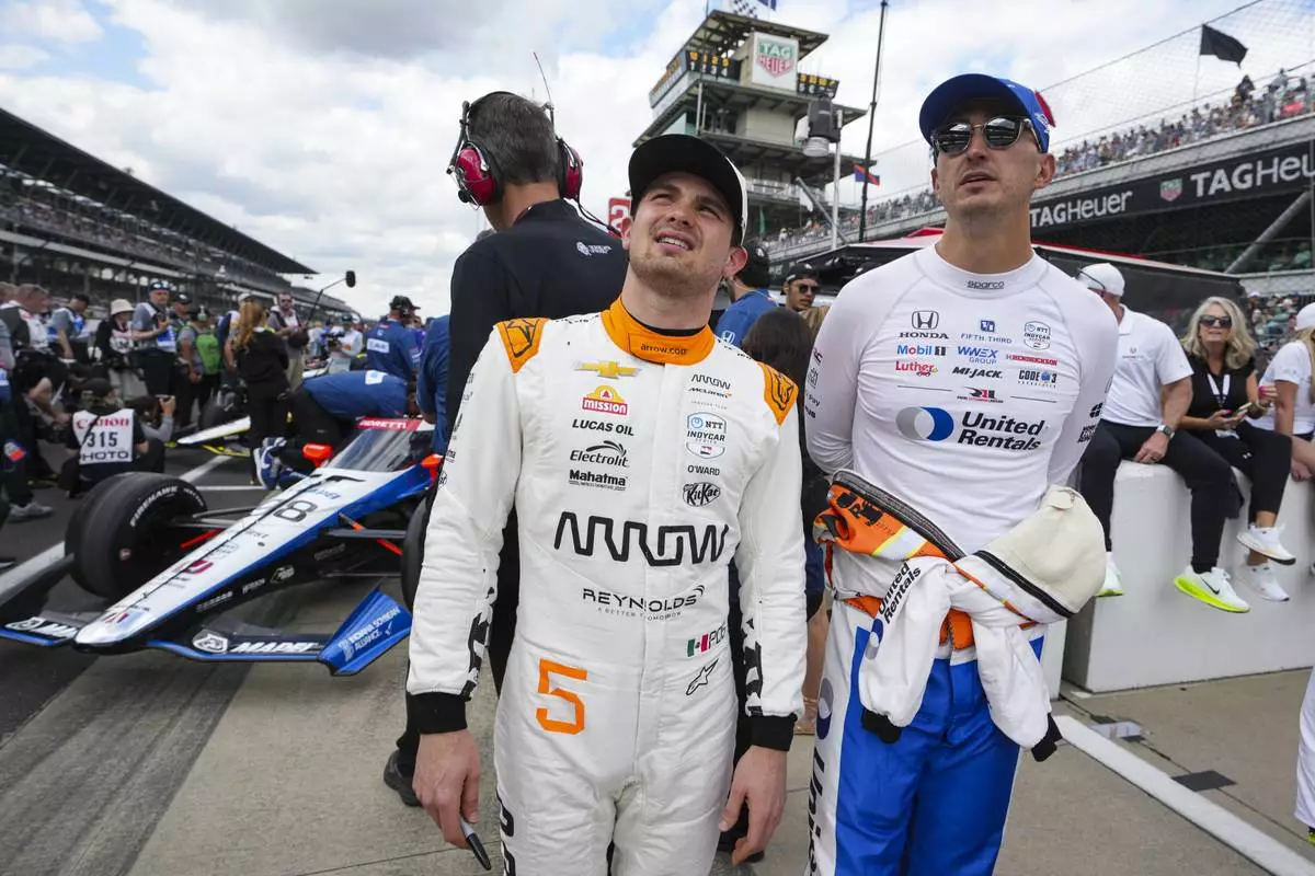 Pato O'Ward, of Mexico, left, watches with Graham Rahal during qualifications for the Indianapolis 500 auto race at Indianapolis Motor Speedway in Indianapolis, Saturday, May 17, 2025. (AP Photo/Michael Conroy)