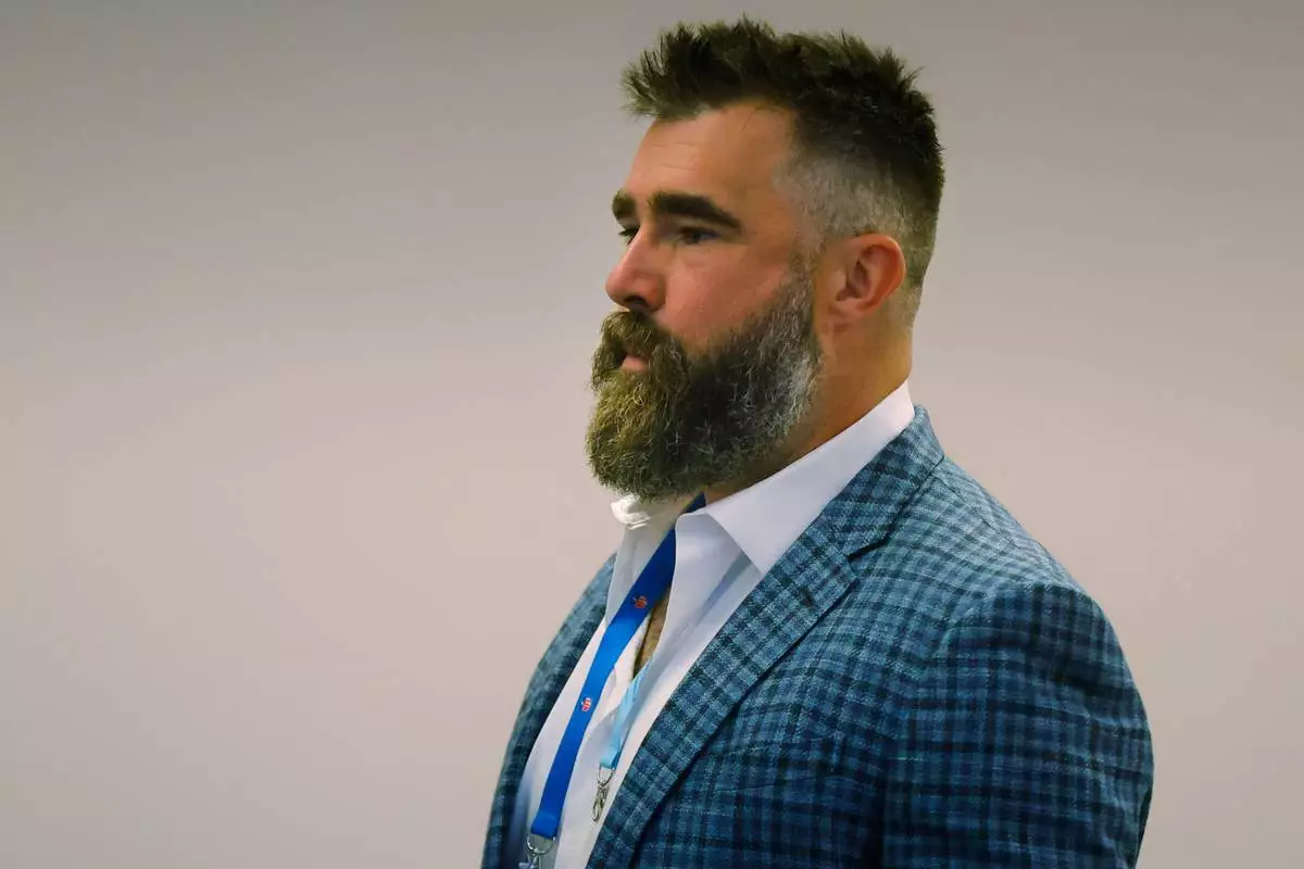Former Philadelphia Eagles center Jason Kelce arrives at the NFL football spring owners meeting, Wednesday, May 21, 2025, in Eagan, Minn. (AP Photo/Bruce Kluckhohn)