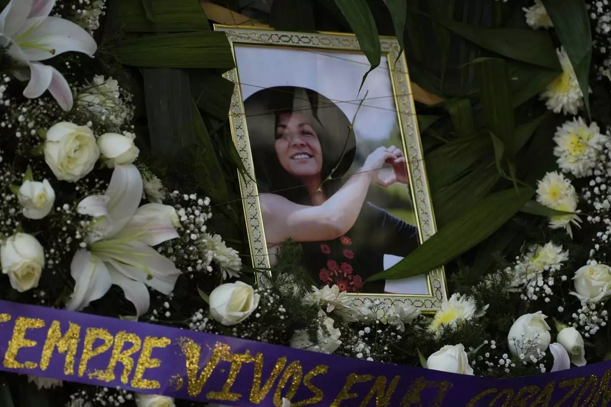 A framed image of Ximena Guzmán, the personal secretary to Mexico City Mayor Clara Brugada who was murdered a day earlier, adorns an altar during a wake at a funeral home in Mexico City, Wednesday, May 21, 2025. (AP Photo/Marco Ugarte)