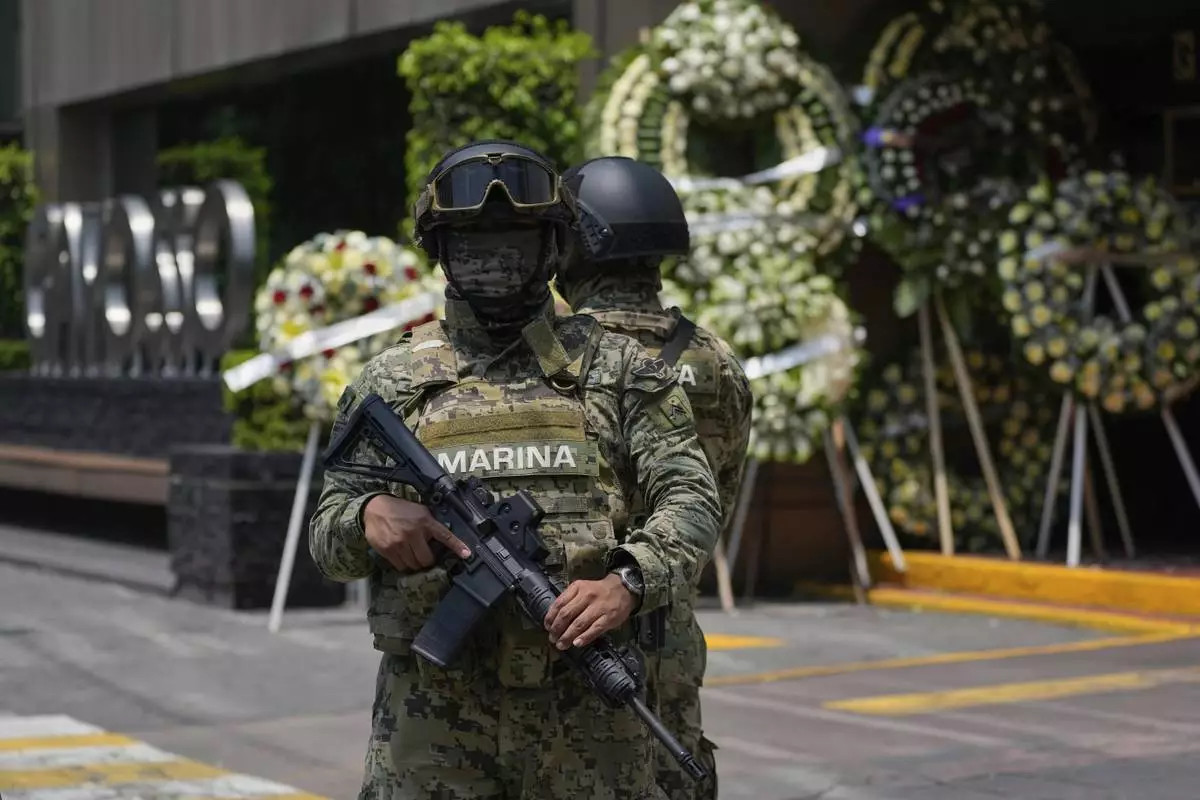 Navy soldiers stand guard outside the funeral home where the remains of Ximena Guzmán, the personal secretary of the Mexico City mayor, and advisor to the mayor, José Muñoz, are being held, in Mexico City, Wednesday, May 21, 2025. (AP Photo/Marco Ugarte)