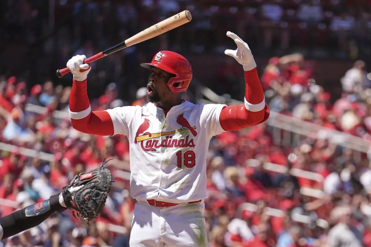 St. Louis Cardinals' Jordan Walker reacts after being called out on strikes during the seventh inning of a baseball game against the Detroit Tigers Wednesday, May 21, 2025, in St. Louis. (AP Photo/Jeff Roberson)