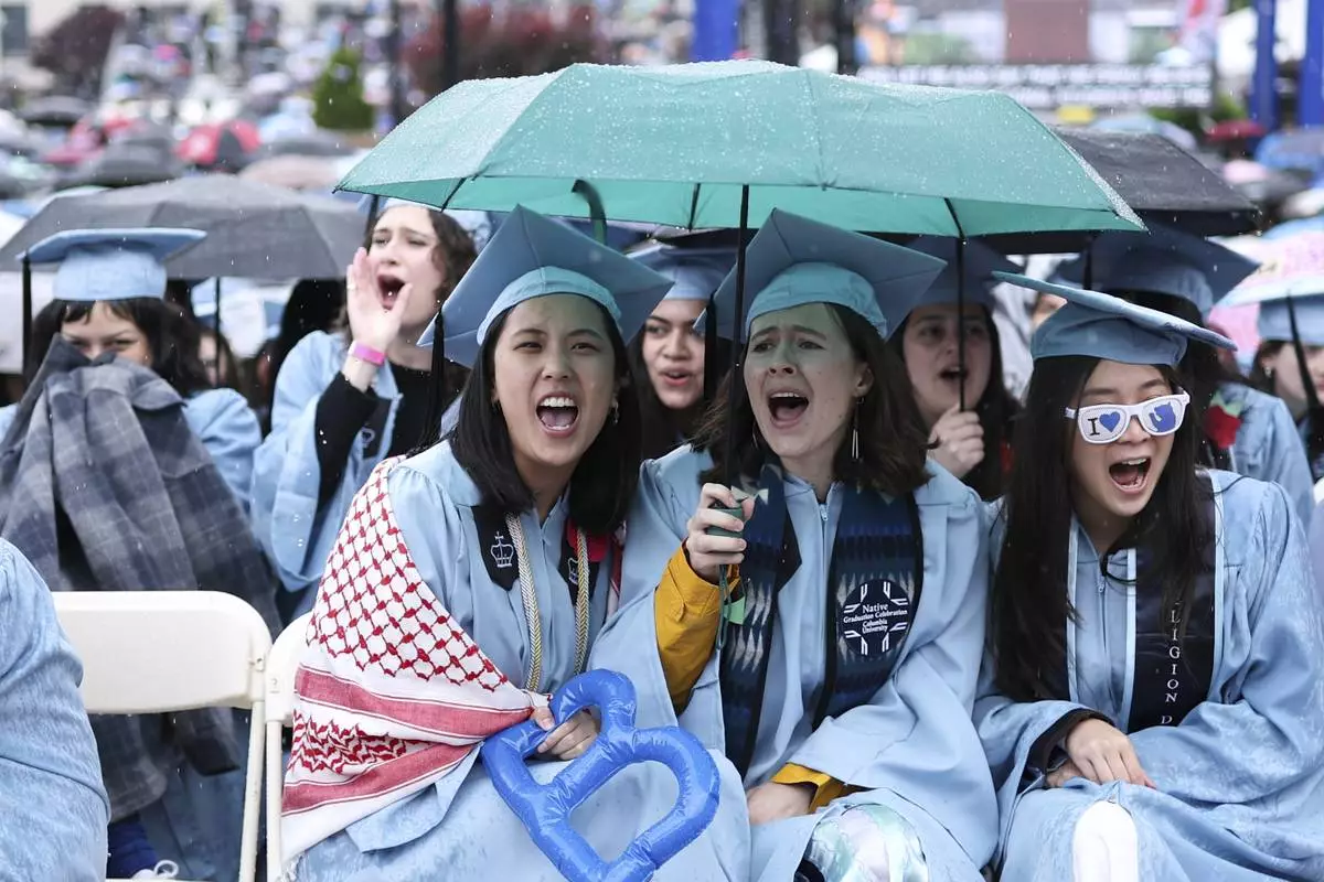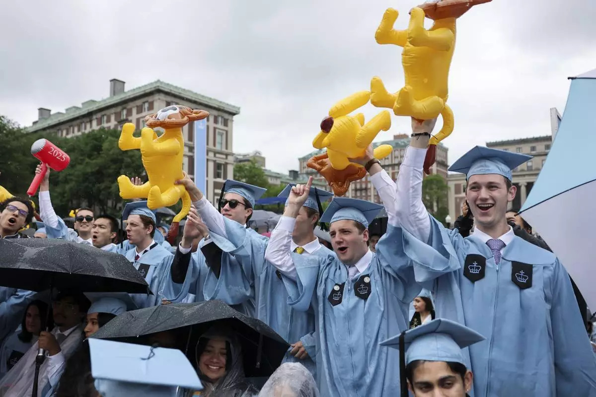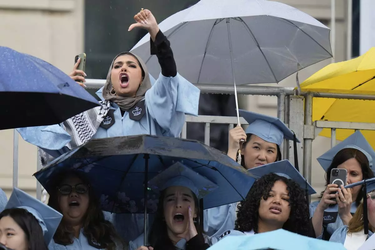 Graduates cheer during the Columbia University commencement ceremony on Columbia's main campus, in Manhattan, on Wednesday, May 21, 2025 in New York. (AP Photo/Seth Wenig, Pool)
