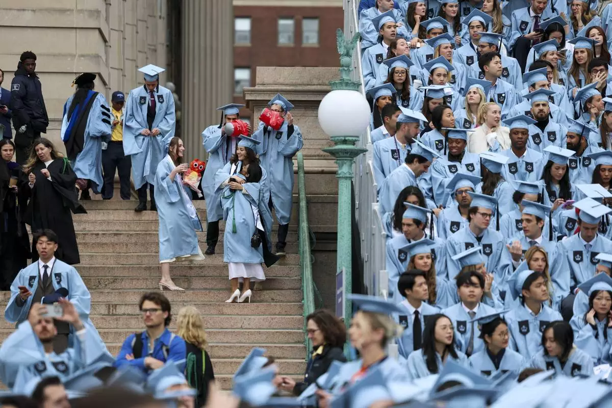 Students gather, on the day of Columbia University commencement ceremony on Columbia's main campus, in Manhattan, on Wednesday, May 21, 2025 in New York. (Jeenah Moon/Pool Photo via AP)