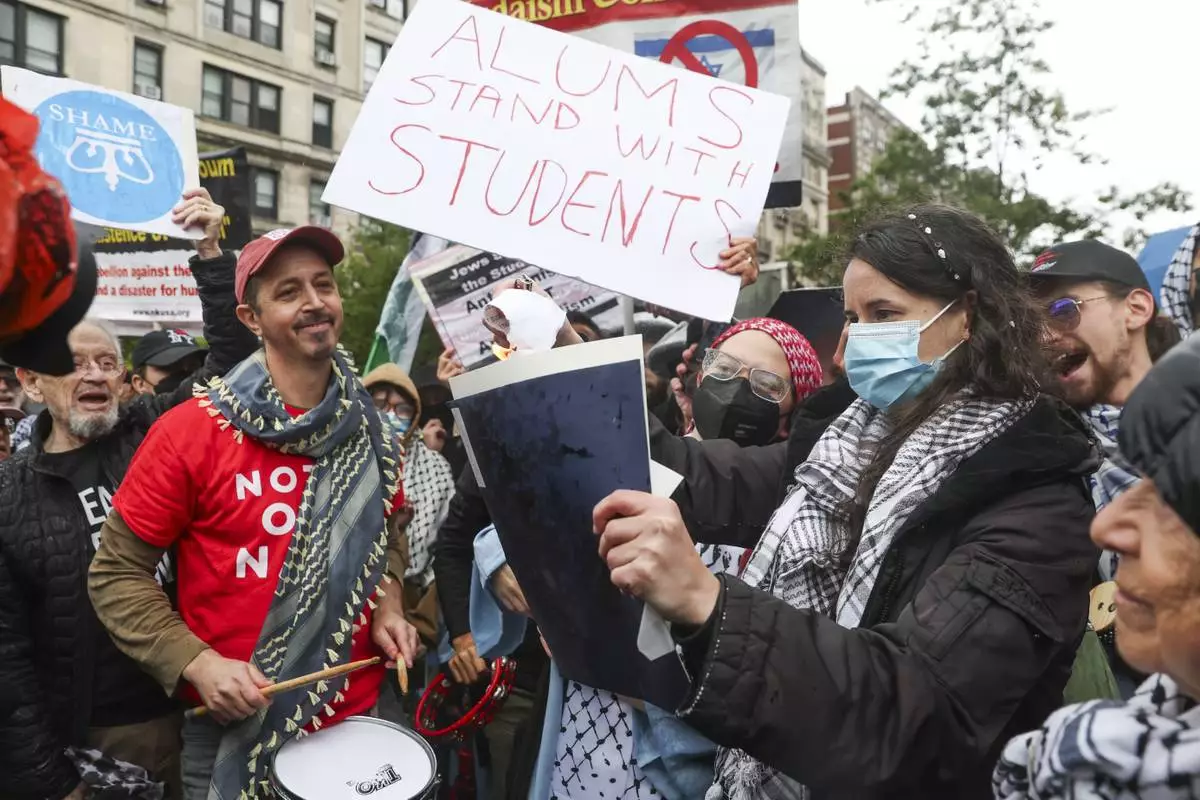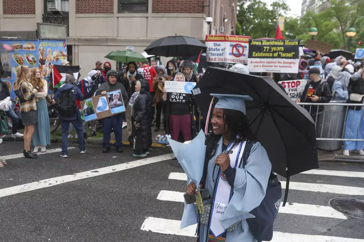 A graduate poses for a photo in front of a group of people protesting in support of Palestinians across the street from the main gates of Columbia University, Wednesday, May 21, 2025, in New York. (AP Photo/Heather Khalifa)
