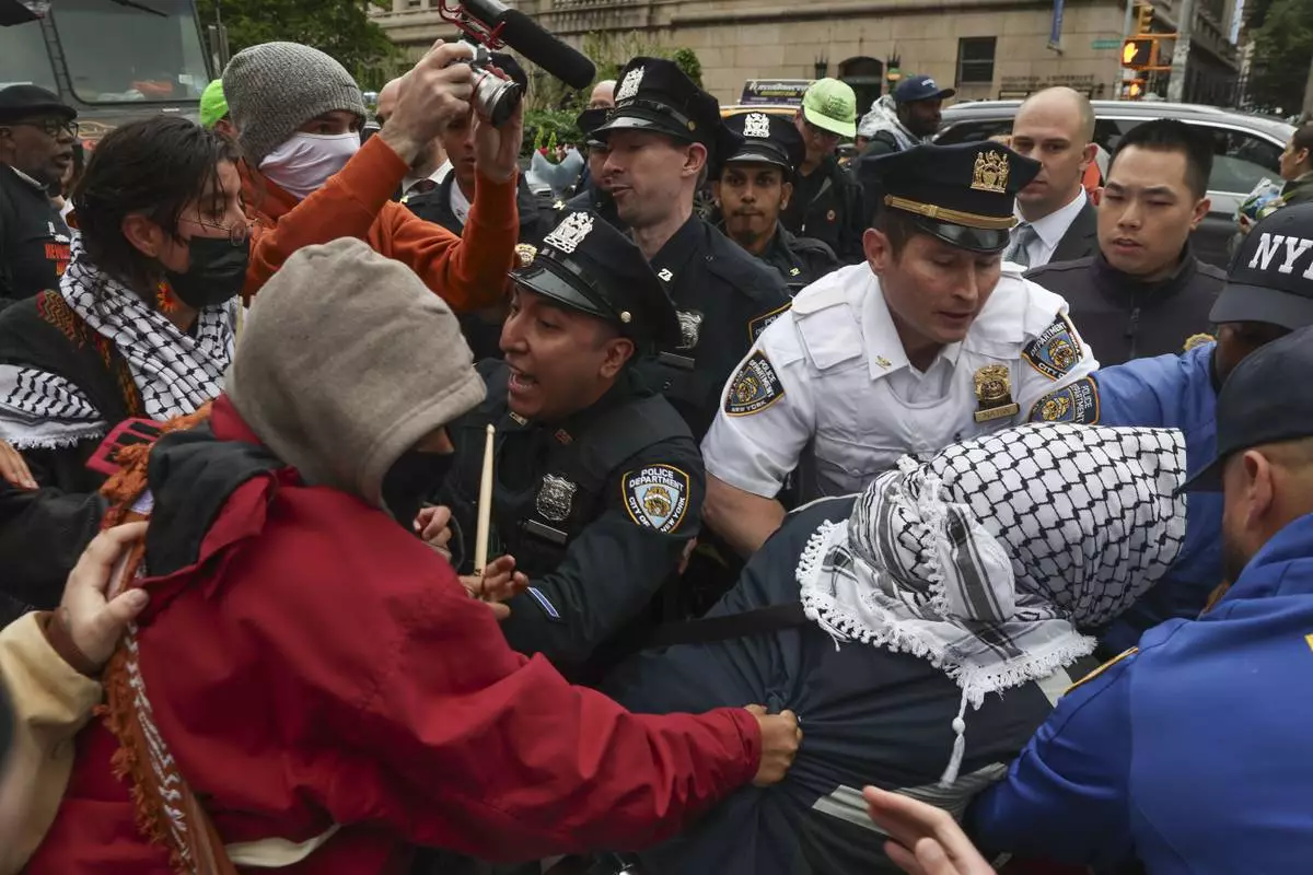 Police and protesters clash across the street from the main gates of Columbia University, Wednesday, May 21, 2025, in New York. (AP Photo/Heather Khalifa)