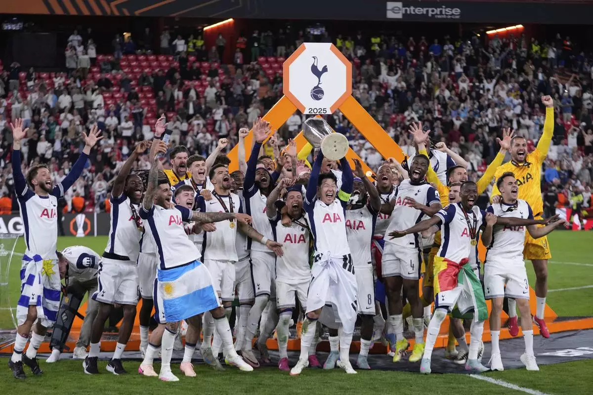 Tottenham's Son Heung-min holds the trophy aloft as he celebrates with teammates after winning the Europa League final soccer match against Manchester United at the San Mames Stadium in Bilbao, Spain, Wednesday, May 21, 2025. (AP Photo/Manu Fernandez)