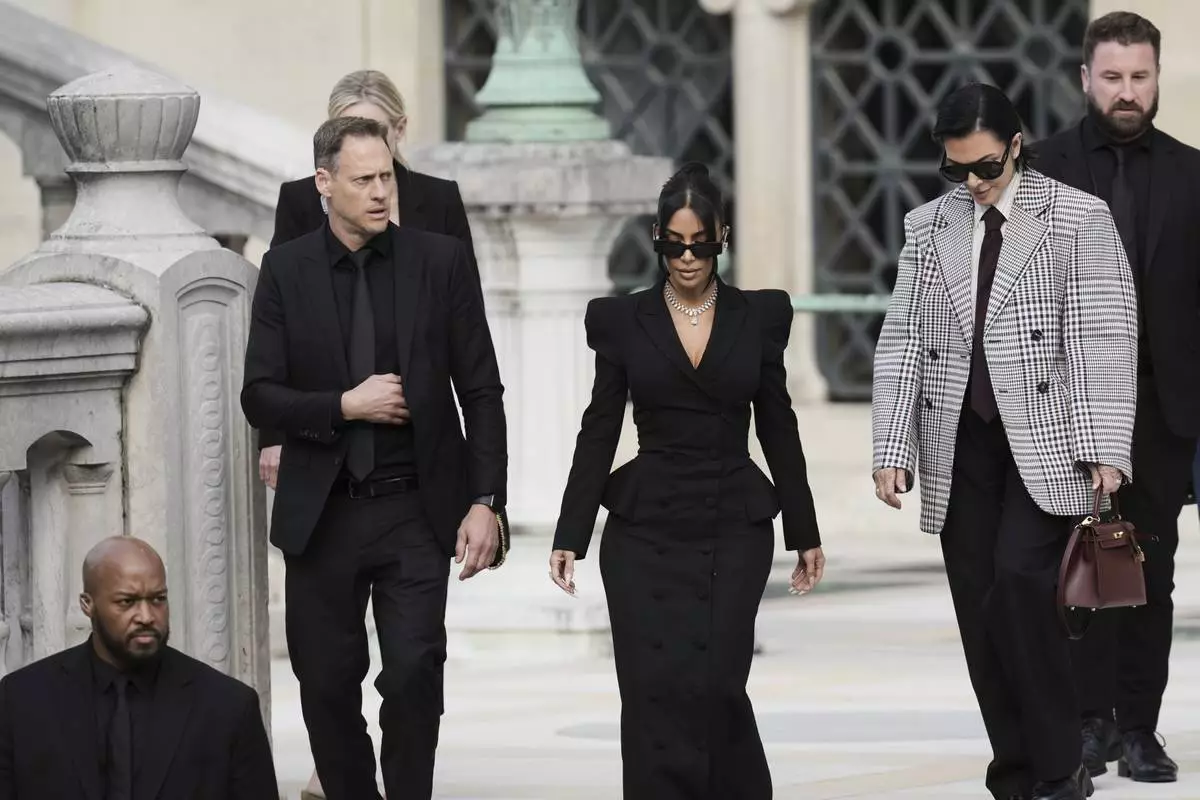 Kim Kardashian, center, accompanied by her mother Kris Jenner, second right, leaves the justice palace after testifying, regarding a robbery of millions of dollars in jewels from her Paris hotel room in 2016, in Paris, Tuesday, May 13, 2025. (AP Photo/Aurelien Morissard)