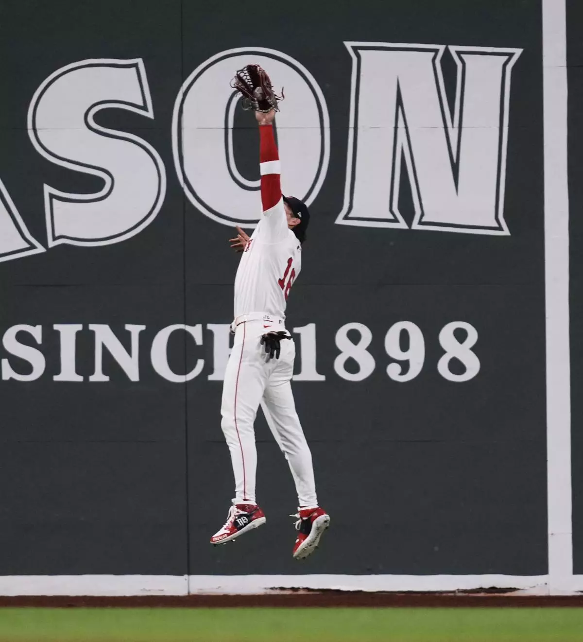 Boston Red Sox outfielder Jarren Duran (16) leaps and makes the catch on a fly out by New York Mets' Francisco Lindor during the fifth inning of a baseball game at Fenway Park, Wednesday, May 21, 2025, in Boston. (AP Photo/Charles Krupa)