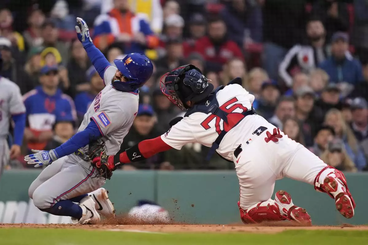 New York Mets' Luis Torrens, left, is tagged out by Boston Red Sox catcher Carlos Narváez while trying to score on a single by Brett Baty during the first inning of a baseball game at Fenway Park, Wednesday, May 21, 2025, in Boston. (AP Photo/Charles Krupa)
