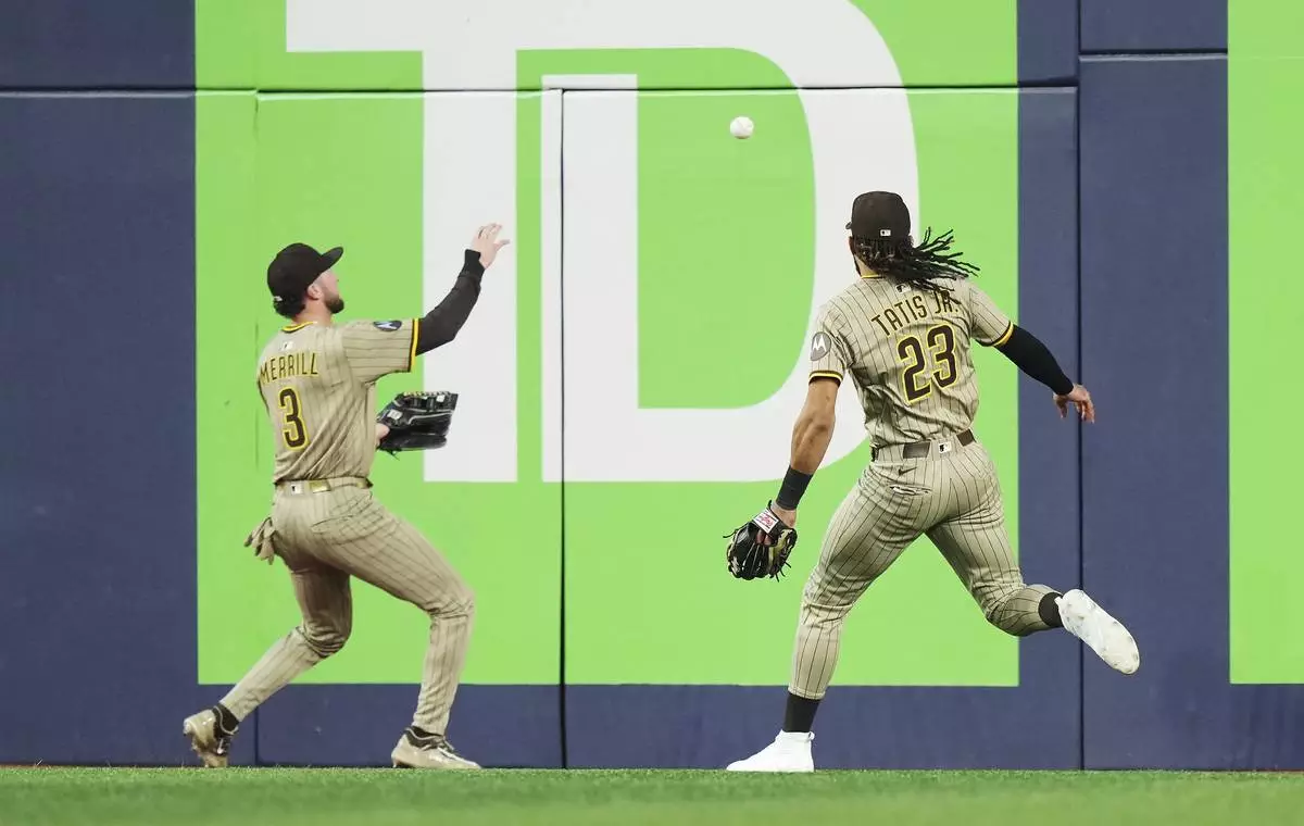 San Diego Padres outfielders Jackson Merrill (3) and Fernando Tatis Jr. (23) field a two-run double off the bat of Toronto Blue Jays' Jonatan Clase during the seventh inning of a baseball game in Toronto on Wednesday, May 21, 2025. (Nathan Denette/The Canadian Press via AP)