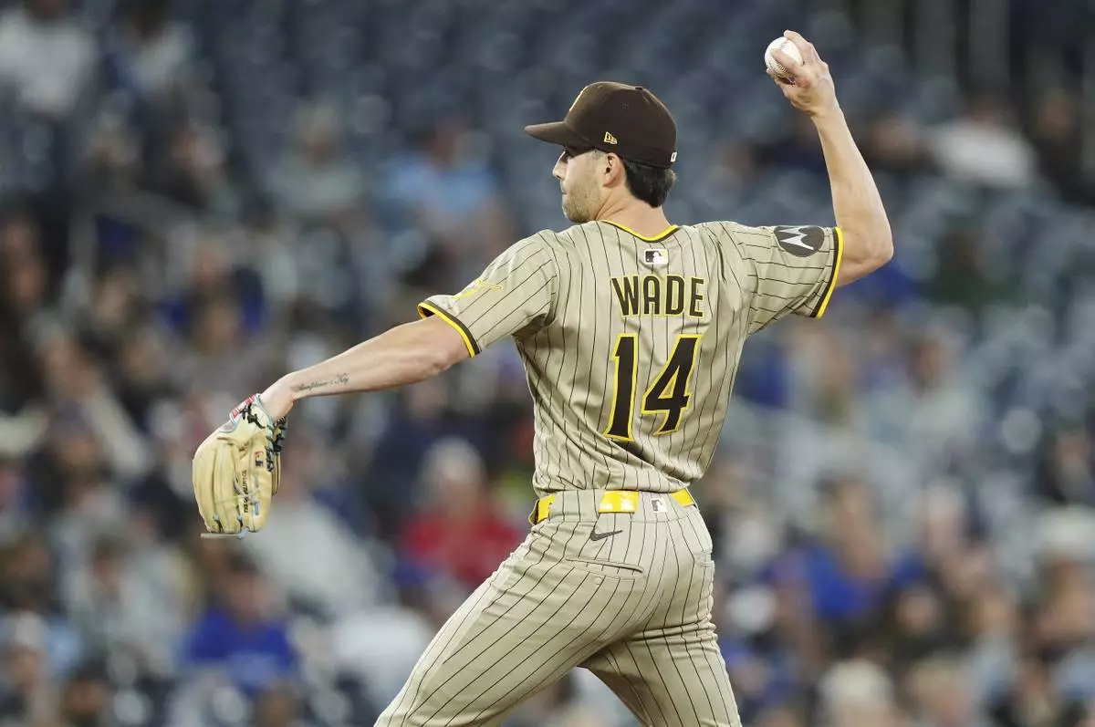 San Diego Padres outfielder Tyler Wade (14) pitches against the Toronto Blue Jays during the eighth inning of a baseball game in Toronto on Wednesday, May 21, 2025. (Nathan Denette/The Canadian Press via AP)