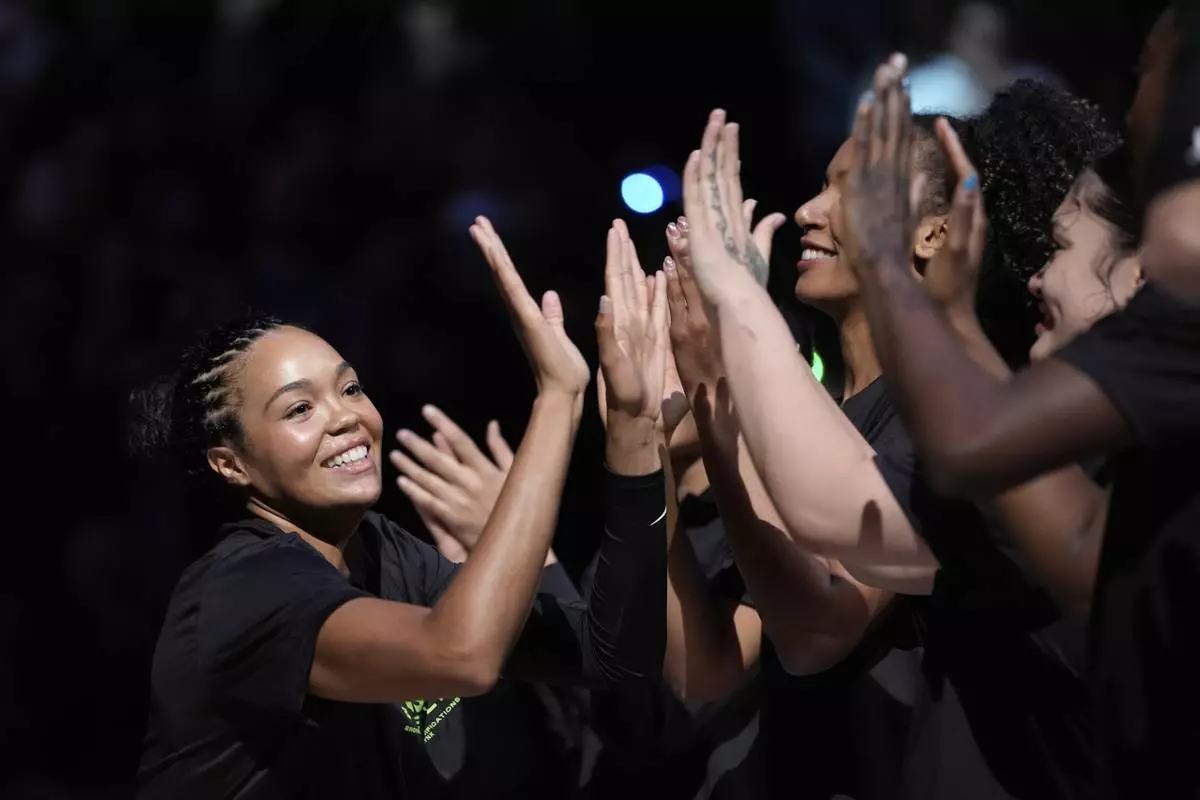 Minnesota Lynx forward Napheesa Collier (24), left, high-fives teammates while introduced before a WNBA basketball game against the Dallas Wings, Wednesday, May 21, 2025, in Minneapolis. (AP Photo/Abbie Parr)