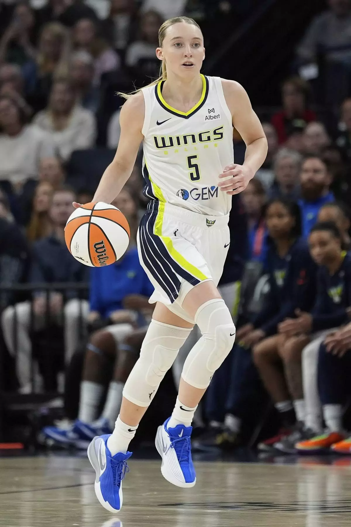 Dallas Wings guard Paige Bueckers (5) dribbles down the court during the first half of a WNBA basketball game against the Minnesota Lynx, Wednesday, May 21, 2025, in Minneapolis. (AP Photo/Abbie Parr)
