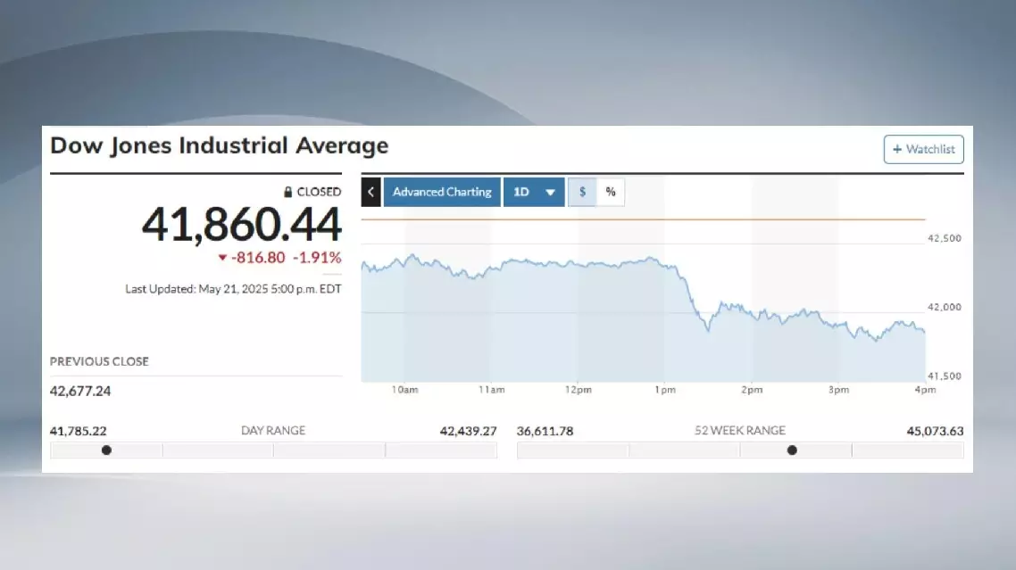 The Dow Jones Industrial Average dropped 816.80 points, or 1.91 percent, to 41,860.44. The S and P 500 fell 95.85 points, or 1.61 percent, to close at 5,844.61, while the Nasdaq Composite lost 270.07 points, or 1.41 percent, ending at 18,872.64, its first negative day in three.