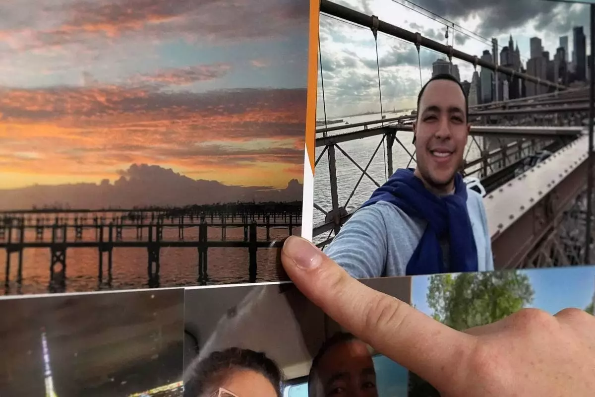 The girlfriend of Juan Serrano, a 28-year-old Colombian migrant with no criminal record who was detained Wednesday, May 21, 2025, at Miami Immigration Court after appearing for a hearing, points to a picture of the barrier island where the pair met while working on a cleanup and demolition crew following 2022's Hurricane Ian, inside their apartment in Oakland Park, Fla. (AP Photo/Rebecca Blackwell)
