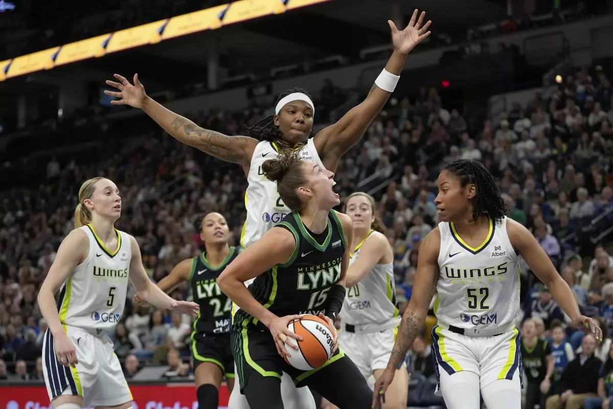 Minnesota Lynx forward Jessica Shepard (15) looks to shoot as Dallas Wings forward Myisha Hines-Allen (2), back, defends during the second half of a WNBA basketball game Wednesday, May 21, 2025, in Minneapolis. (AP Photo/Abbie Parr)