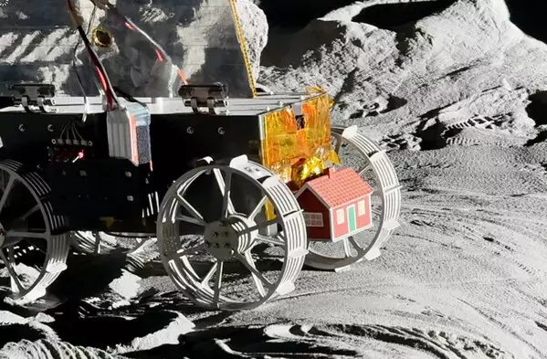 Mounted on the front of the lunar rover TENACIOUS is the house itself. Once the lander touches down, the rover will be deployed to scout the Moon's surface for the perfect site.