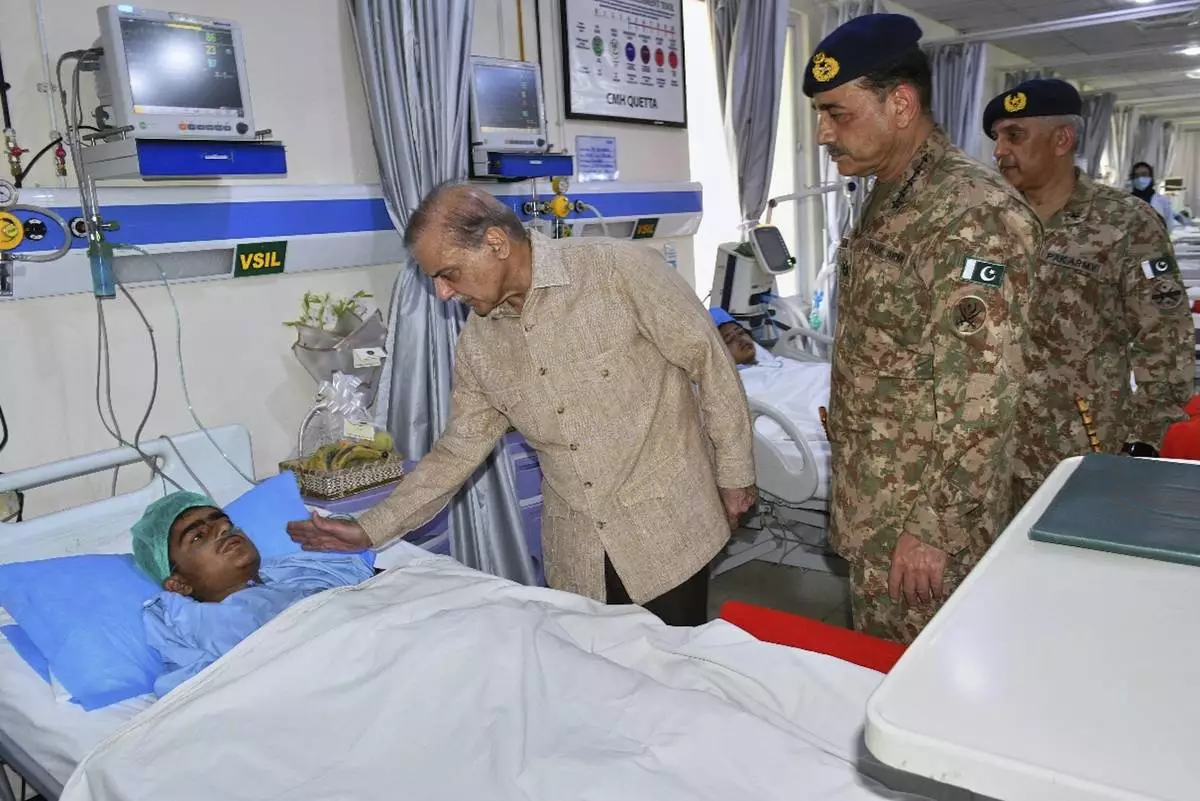 In this photo released by the Prime Minister Office, Prime Minister Shehbaz Sharif, center, checks on a child injured in the suicide bombing in Khuzdar, as Army Chief Field Marshal Asim Munir, second right, looks on during their visit to a hospital in Quetta, Pakistan, Wednesday, May 21, 2025. (Prime Minister Office via AP)