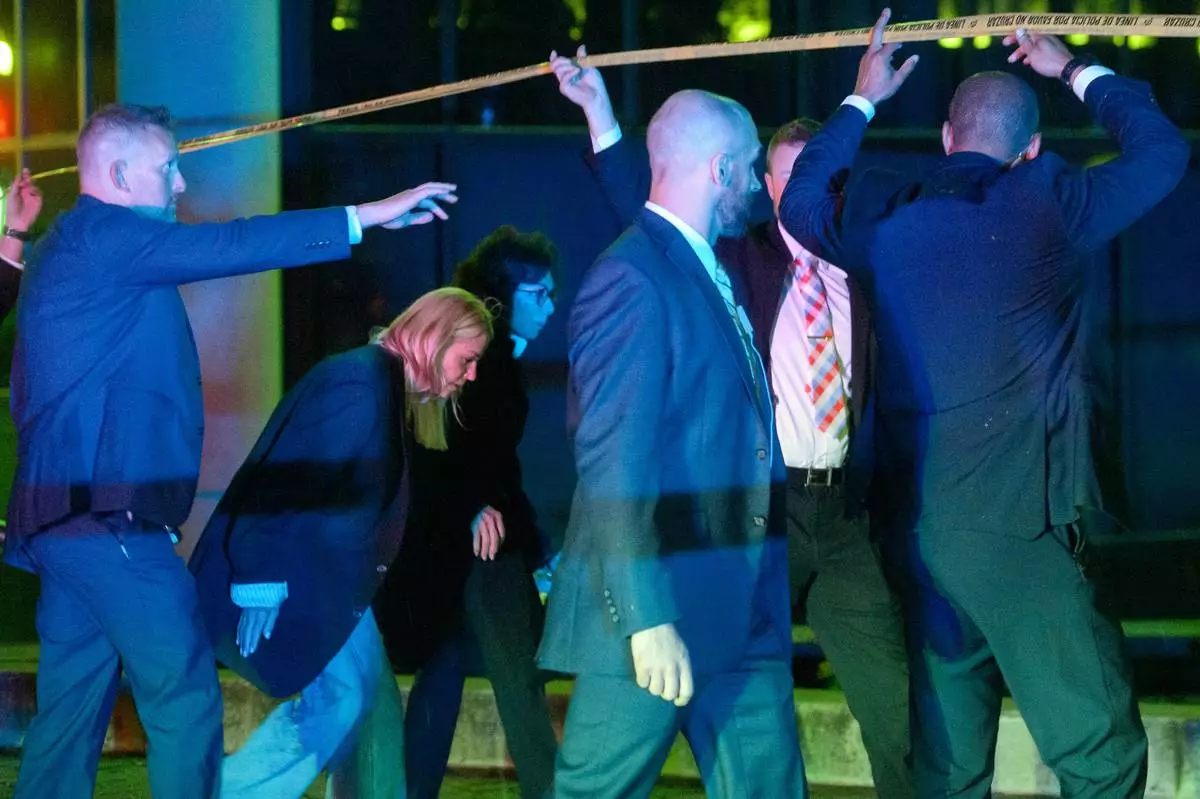 Attorney General Pam Bondi, from second left, and U.S. Attorney for the District of Columbia Jeanine Pirro walk to cars as law enforcement work the scene after two staff members of the Israeli Embassy in Washington were shot and killed outside the Capital Jewish Museum, Thursday, May 22, 2025, in Washington. (AP Photo/Rod Lamkey, Jr.)