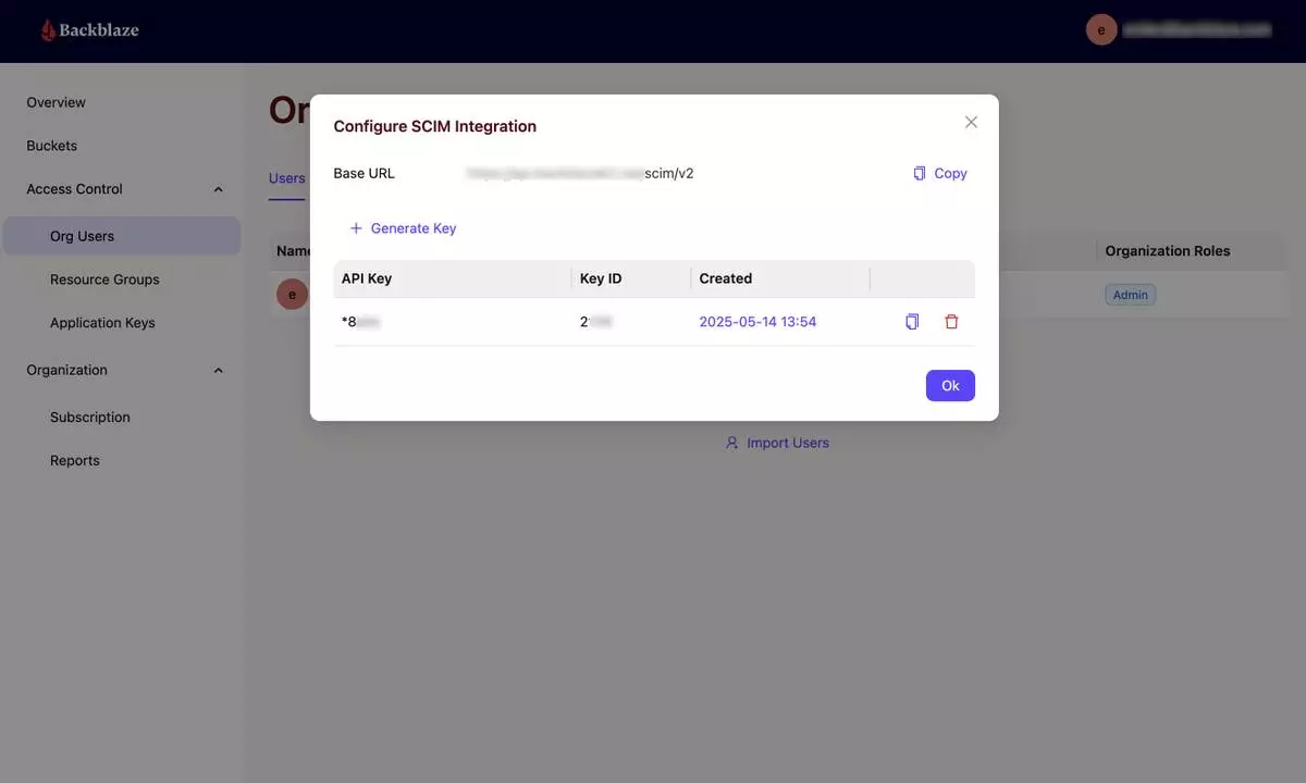 Backblaze's upcoming Enterprise Web Console showcasing SCIM configuration.