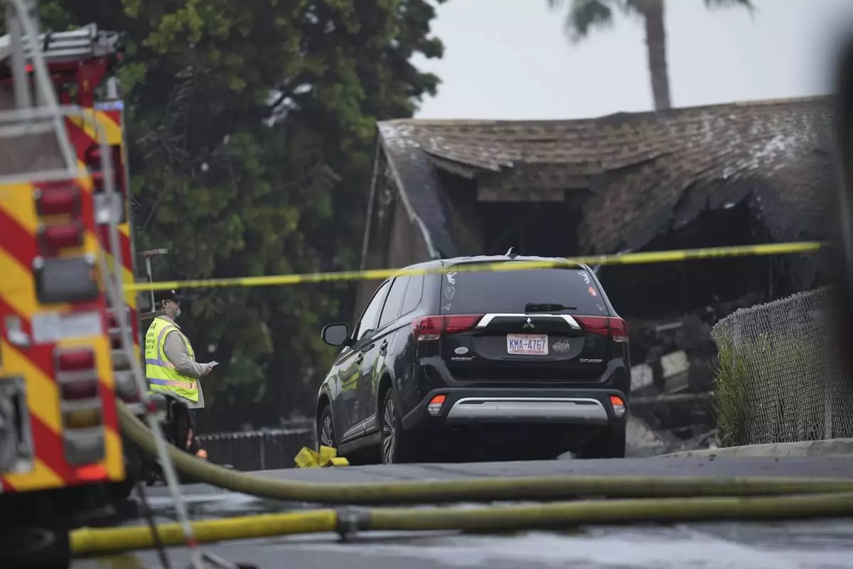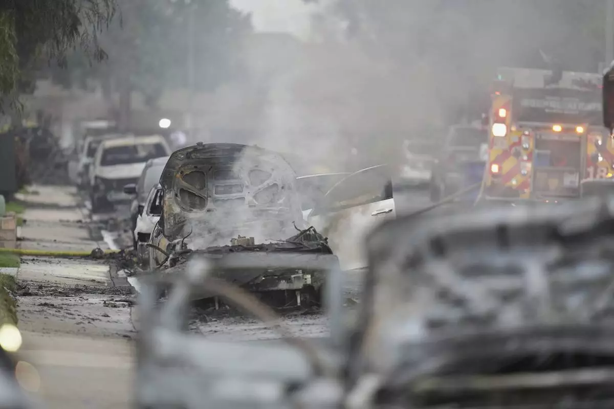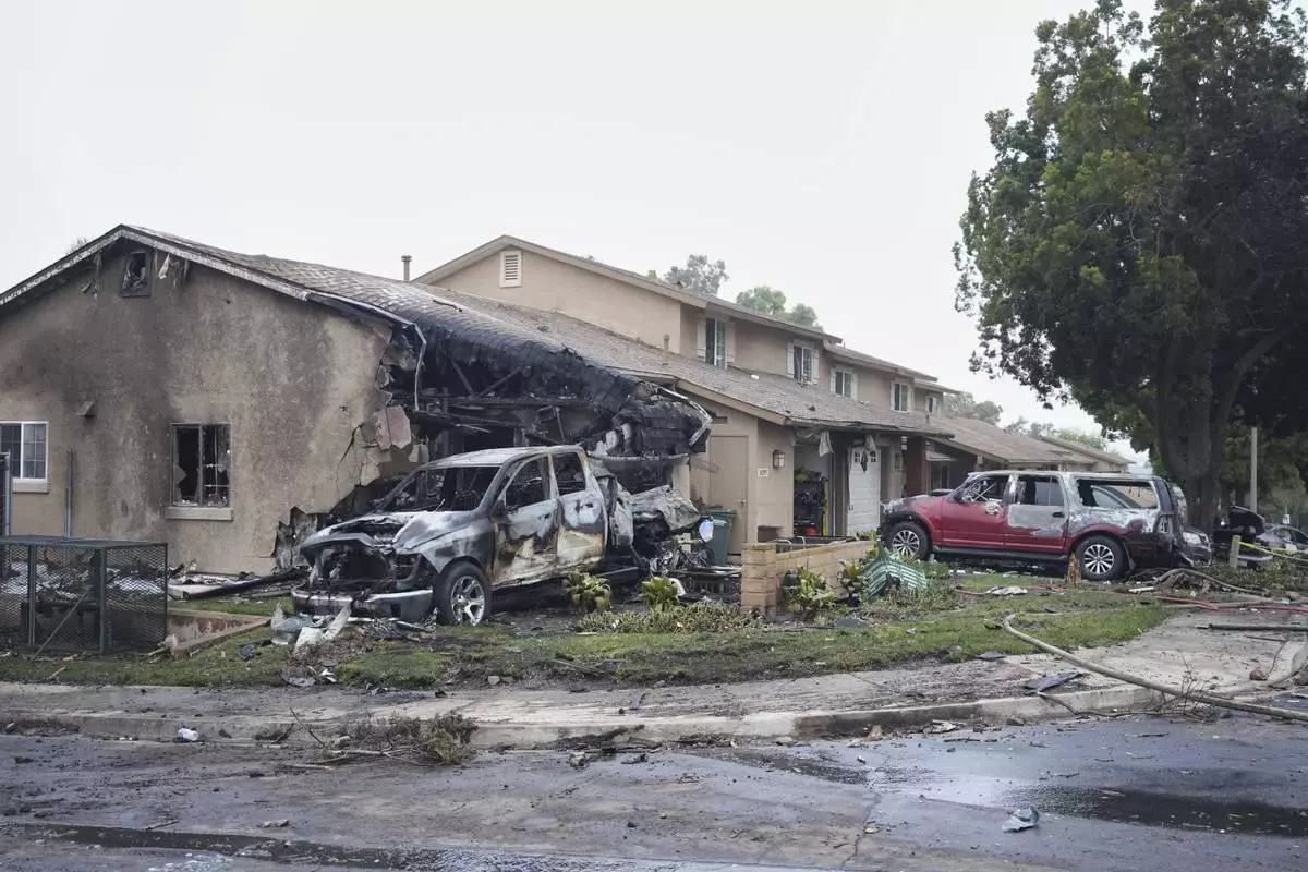Vehicles and houses are damages after a small plane crashed into a San Diego neighborhood, setting several homes on fire and forcing evacuations along several blocks early Thursday, May 22, 2025. (AP Photo/Gregory Bull)