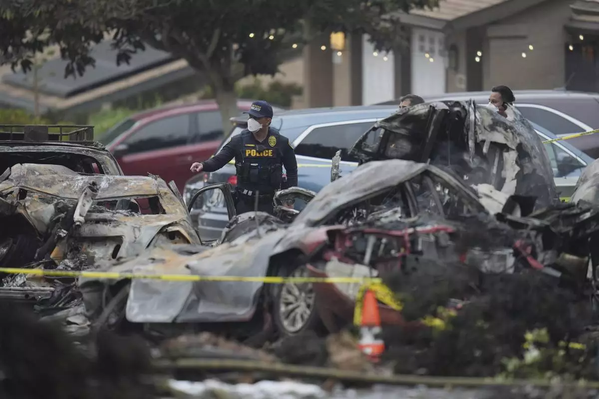Vehicles are damaged as authorities work the scene where a small plane crashed into a San Diego neighborhood, setting several homes on fire and forcing evacuations along several blocks early Thursday, May 22, 2025. (AP Photo/Gregory Bull)